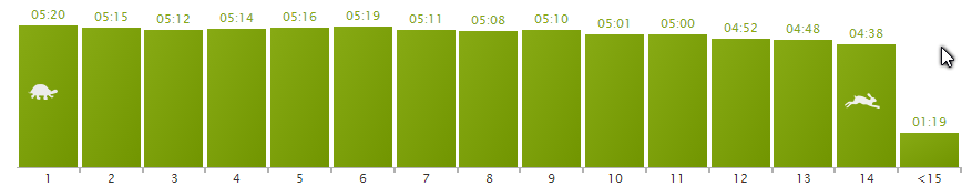 Los últimos 4km fueron por debajo de 5'00/km, aunque los mejores fueron los 3 últimos: 4'52-4'48 y 4'38.